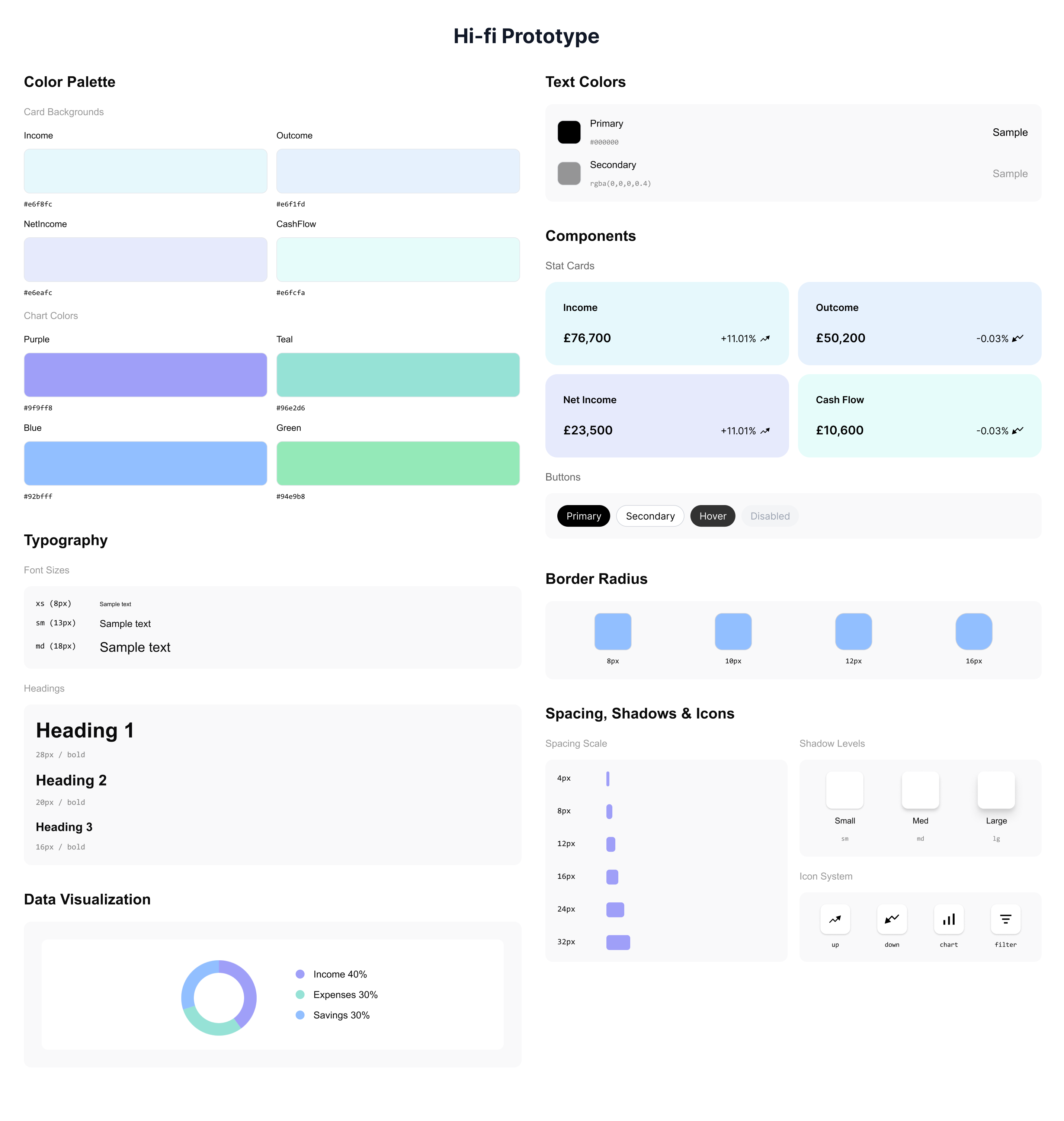 It establishes the core visual foundations, including color palettes, type scales, spacing rules, border radii, and shadow styles. This ensures every component feels consistent and intentional across the interface.