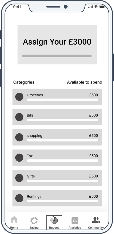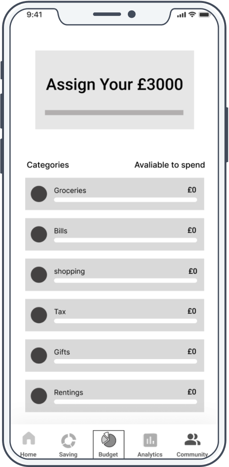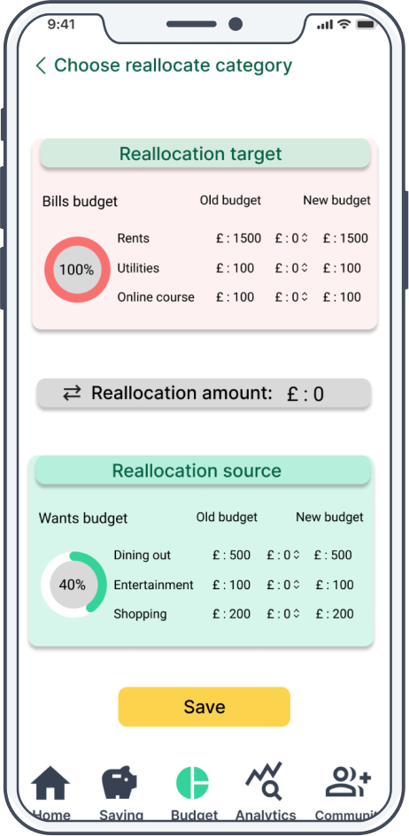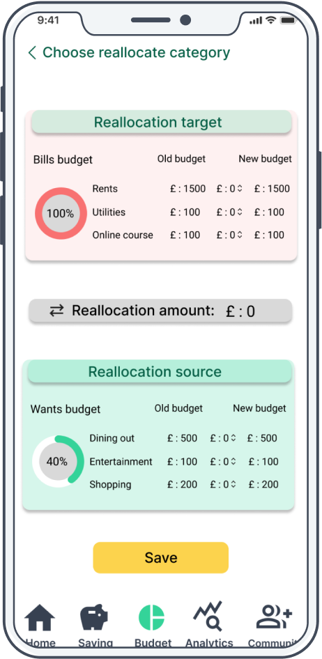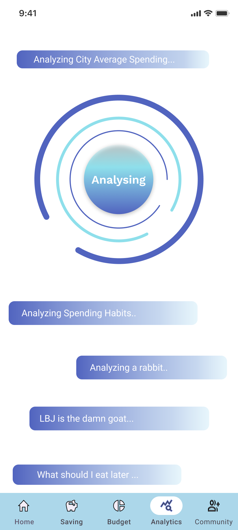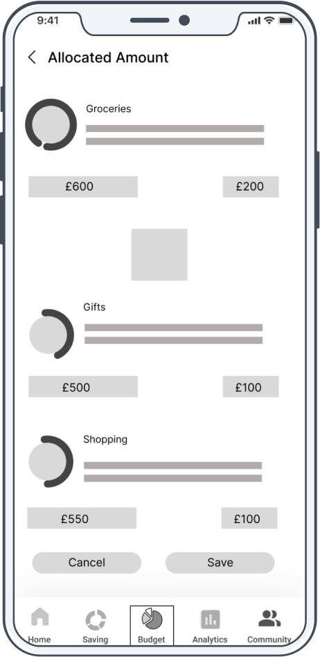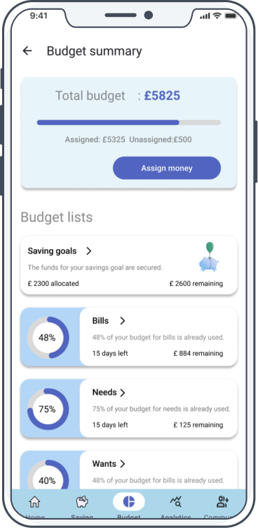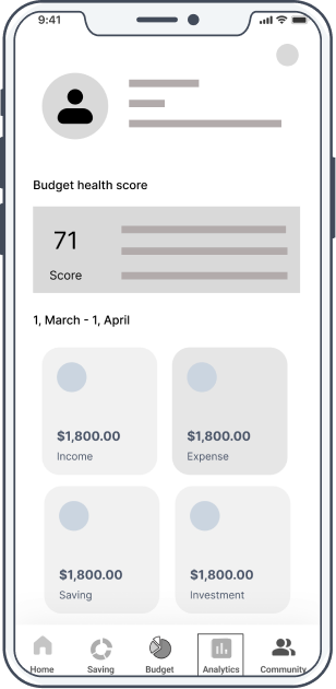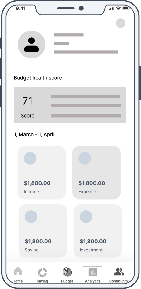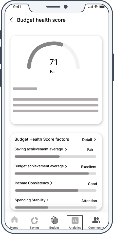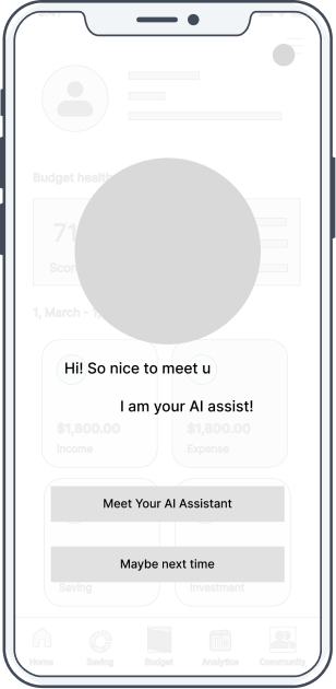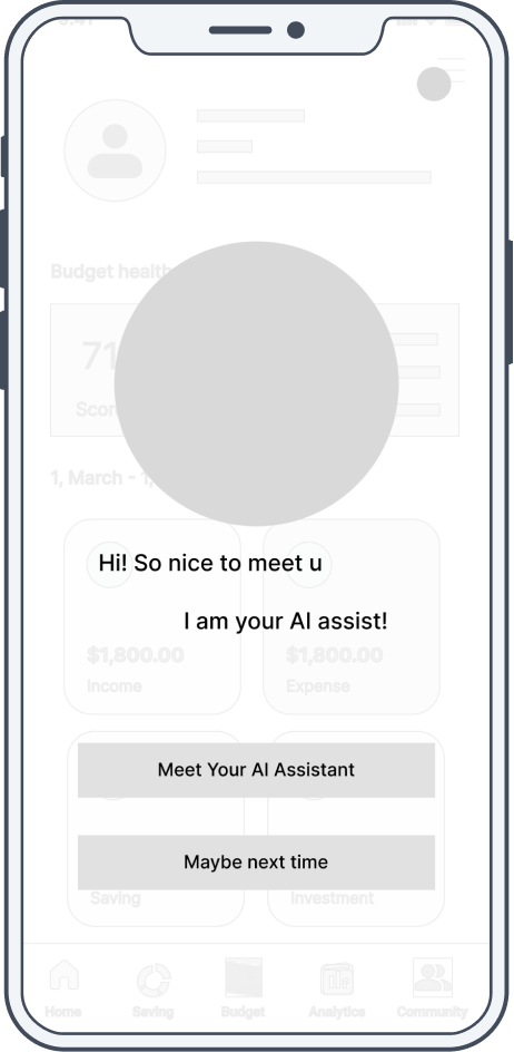 I designed four core interaction flows—Saving, Budget, Analytics, and AI—to guide users through goal setting, expense tracking, insights, and personalized assistance with clarity and efficiency.