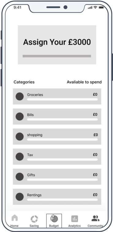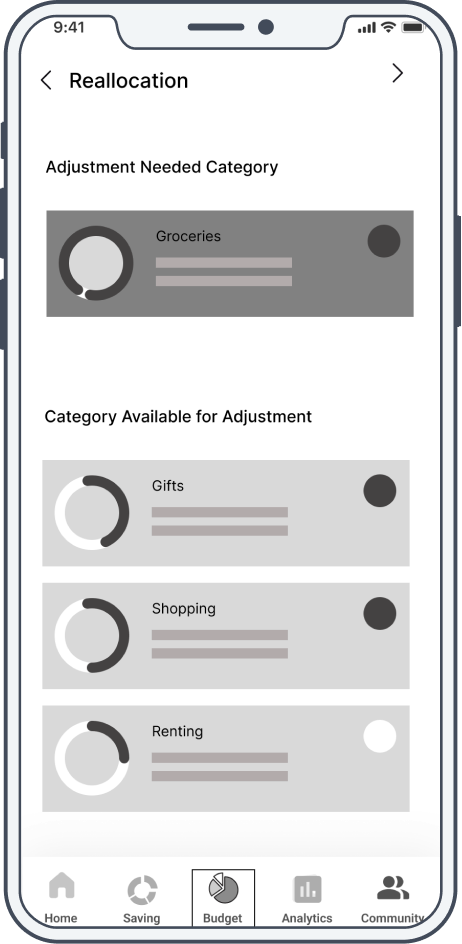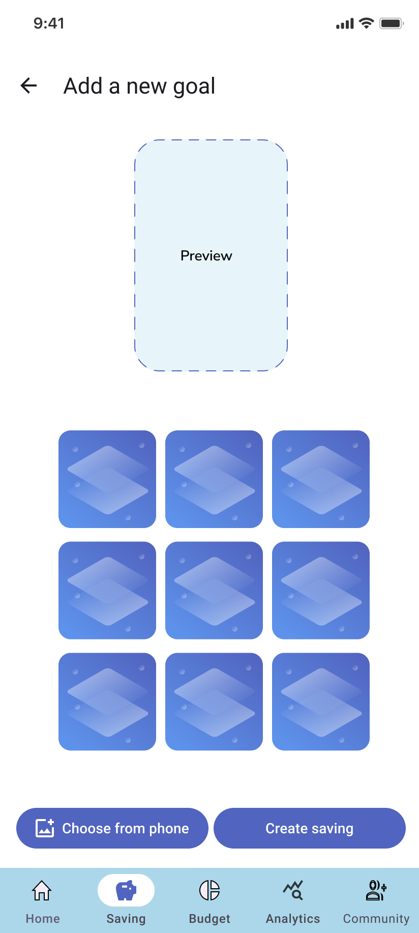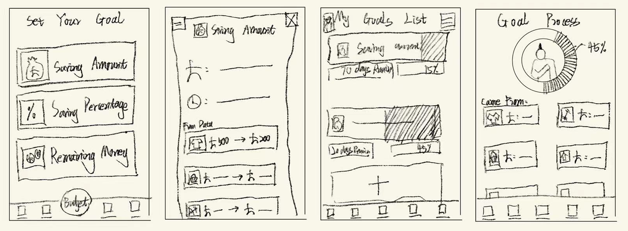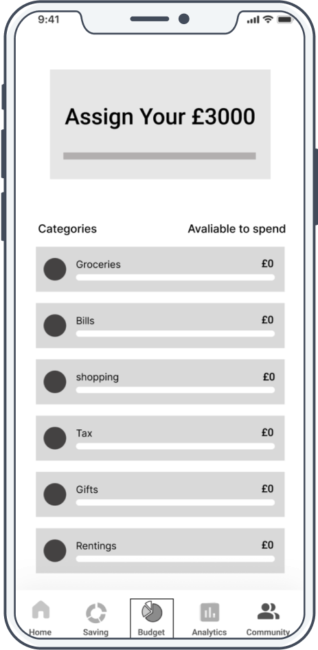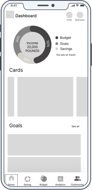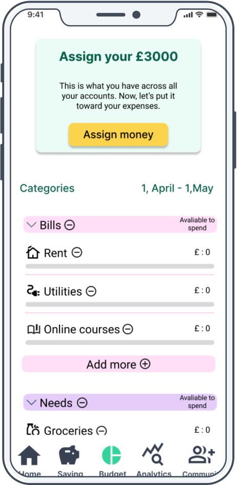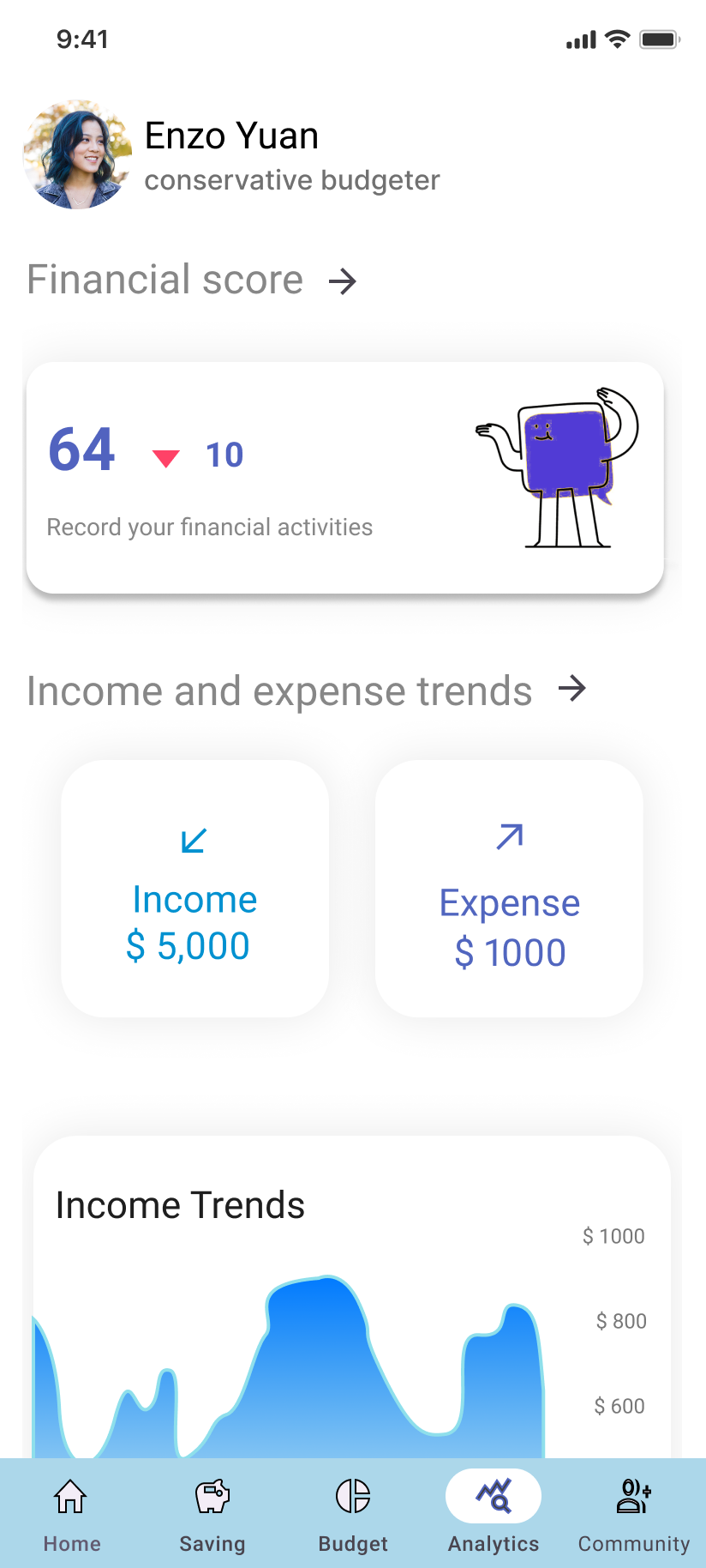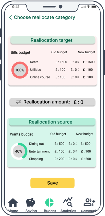 I designed four core interaction flows—Saving, Budget, Analytics, and AI—to guide users through goal setting, expense tracking, insights, and personalized assistance with clarity and efficiency.