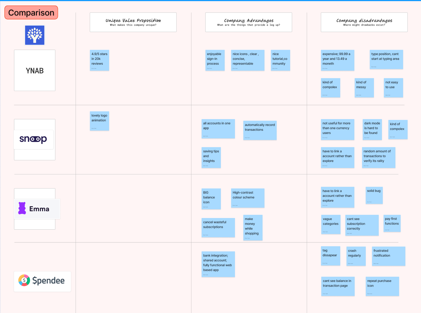 I conducted a competitive audit to compare existing budgeting apps and identify strengths, weaknesses, and gaps in the market, helping inform feature opportunities and differentiation for my design.